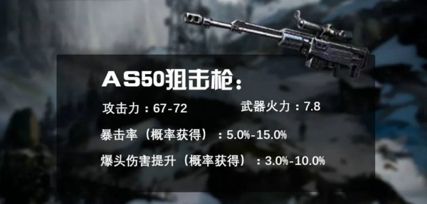 如果你是一名百步穿杨的狙击手,那么AS50狙击枪一定不能错过,选择暴击率和爆头伤害提升,千里之外可取敌军首级,这里还要提到两个成长性武器,强袭榴弹炮和95式突击步枪