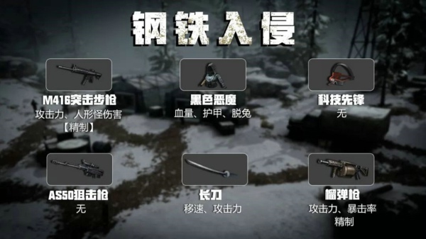 钢铁入侵建议使用M416突击步枪,AS50狙击枪,长刀,榴弹枪,科技先锋,黑色恶魔。