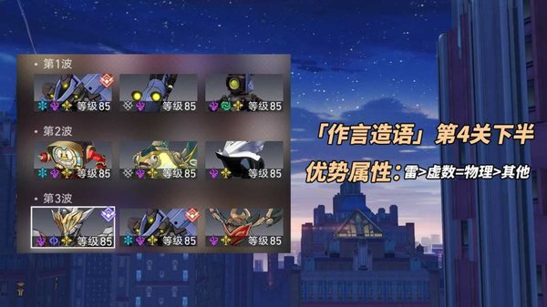 这一关优势属性是雷>虚数=物理>其他,敌人也没有特殊抗性。