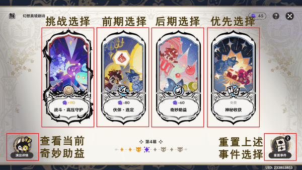 演出过程中会触发不同的事件,前期尽量选择获得伙伴的选项,优先“神秘收获”,为后期储备“奇妙助益”。