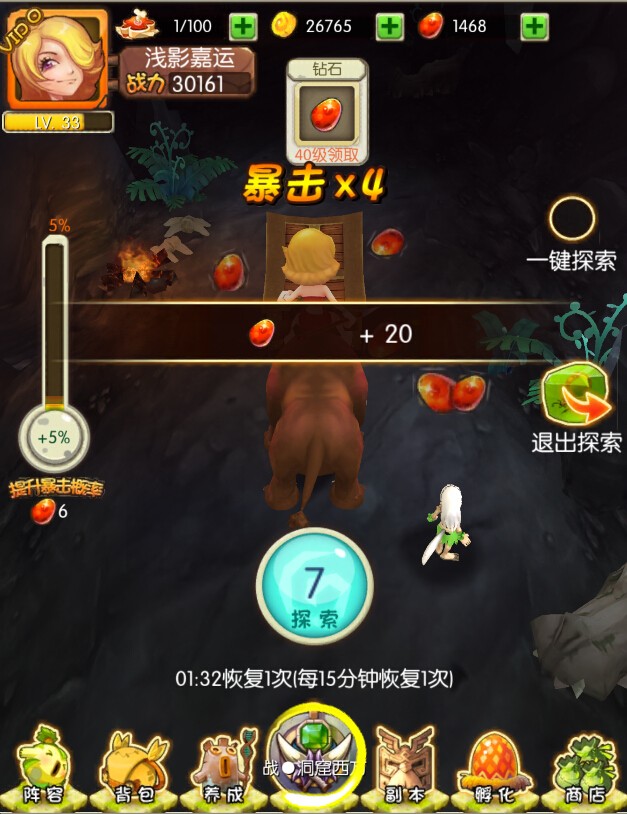探索可获得经验、金币、宝箱、宠物、探索次数等奖励,根据探索界面左侧显示的当前暴击概率,探索时还有可能获得4倍奖励,各位勇士可在探索前消耗钻石提升奖励暴击概率。另外,每日使用钻石提升探索奖励暴击概率,是对全天都有效的,效果截止时间是当日的服务器时间23:59:59。