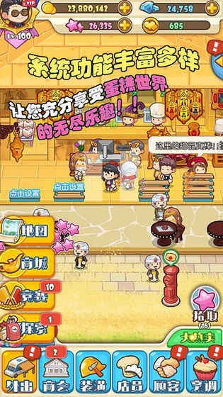 2、Q萌画风,百种角色,让你遇到意想不到的食客。亲手打造你的风格店铺,千种选择,万里无一。