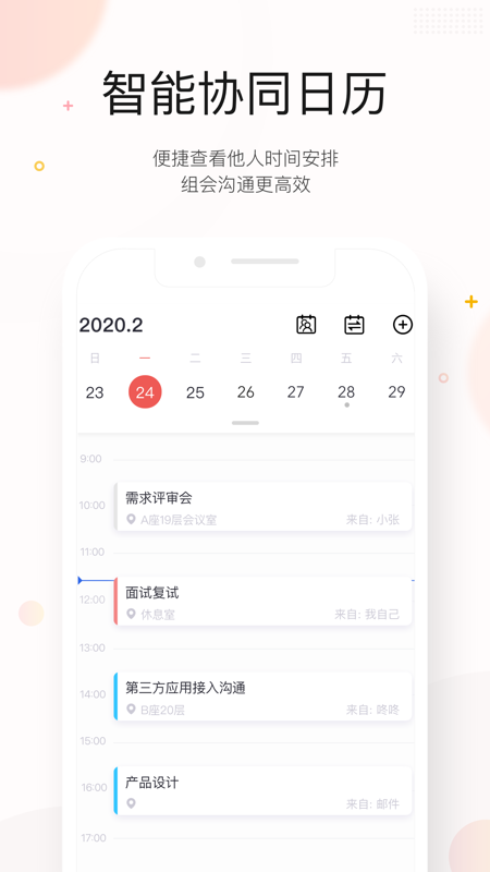 3、智能协同日历,方便查看其他人的时间安排,群组会议沟通更高效。