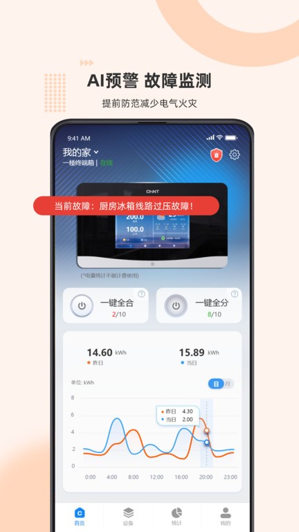 2、故障提醒:全面监测线路状况,及时主动推送线路预警和线路故障信息,大大提高家庭用电安全。