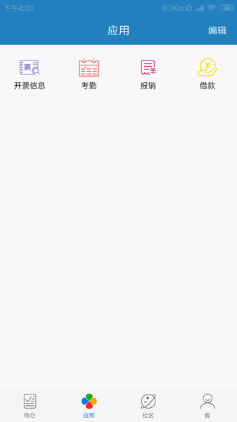 4、提供多种应用功能图标,应用中心为用户提供考勤、报销、借阅等常用功能。