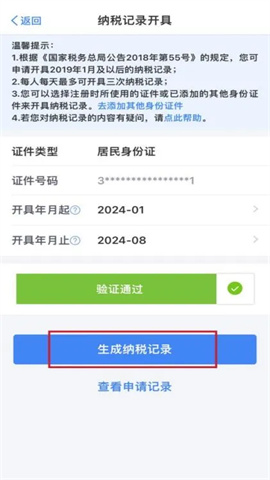 2、确定需要打印的税款所属月份(支持跨年选择),通过拖动滑块完成安全验证,然后点击“生成纳税记录”按钮。