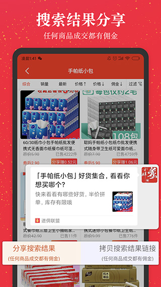 6、搜索过滤/共享:分享一次佣金在10元以上的口红,每笔交易都会有佣金。