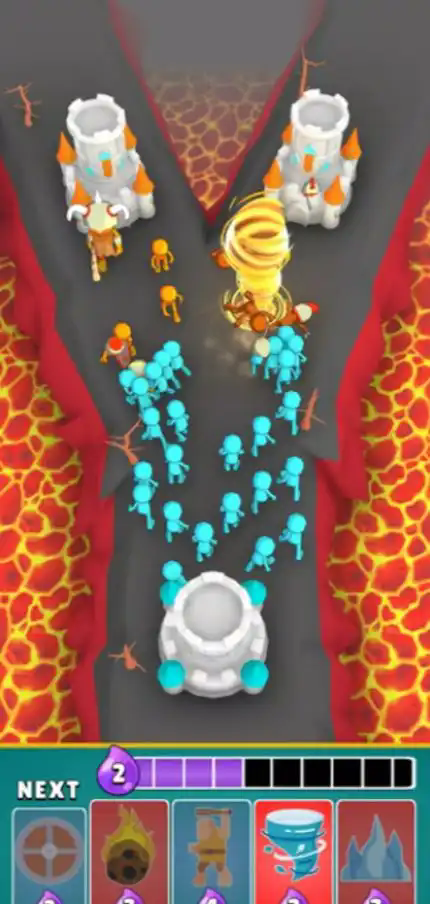 2、游戏玩法更侧重于推塔对战,玩家可以通过卡牌召唤橡胶人和法术,放置在中间的道路上,攻击敌方城堡。