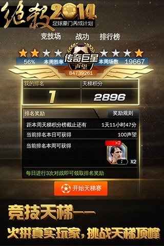 2、绝杀2014是一款为足球爱好者定制的游戏,融合了高度拟真的现实欧洲足球世界与经典卡牌游戏玩法。