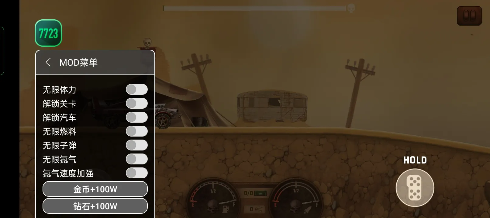3、一旦第一辆车无法继续,就可以切换到备用车,但记得先把油箱加满哦;继续按住右侧按钮前进,保持撞击僵尸的节奏!