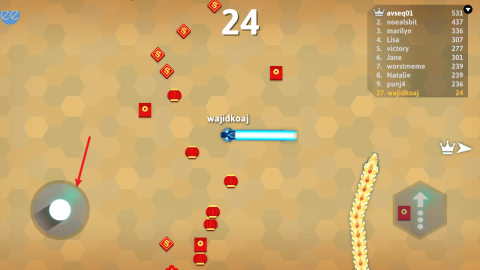 1、进入游戏后,通过左侧的摇杆控制贪吃蛇的移动。