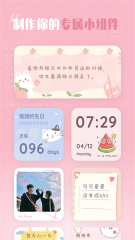 2、可添加炫酷时钟、偶像照片、文字图片、倒计时、纪念日、快捷方式、计步、天气等功能。